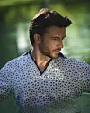 Te zien is hoe Bailey naast een zwembad poseert is zwemshorts van het merk Orlebar Brown, dat bekend staat om zijn vrolijke prints vol kleuren en bloemen. Op een van de foto’s ligt Bailey in een zwembad vol bloemen, op een andere foto wordt hij bekogeld met citroenen.