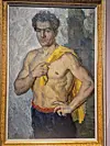 Hoe verder terug in de tijd, hoe ambivalenter de beelden als het gaat om queer identiteit. Neem ‘De balletdanser’ van Vladimir Pavlovich Bogomazov uit 1964 bij de Utrechtse galerie Daatselaar (stand 40, daatselaar.com). Bogomazov schilderde in stevige stroken een behoorlijk gespierde torso, met uitgesproken gele en rode accenten. De Rus was geïnteresseerd in het laten zien van karakter en kracht via de menselijke vorm, meldt Daatselaar. Er komen nogal wat boksers en turners voorbij – niet in Sovjet-realistische stijl, daarvoor is Bogomazov te subtiel.