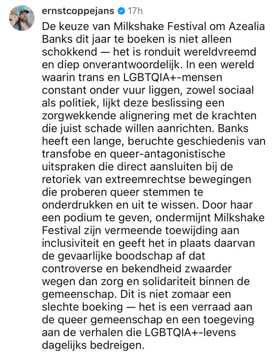 Update 6 februari: Milkshake heeft inmiddels op Instagram laten weten dat Azealia Banks niet meer op het festival zal optreden.
